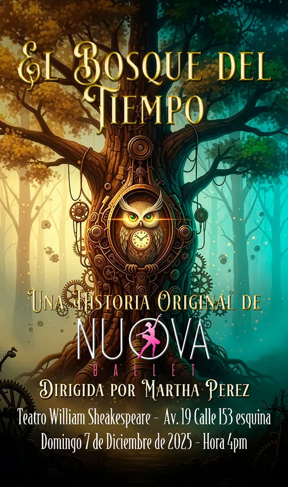 El Bosque del tiempo venta de boletería a partir del jueves 20 de noviembre 4:00 p.m. en instalaciones de NUOVA Domingo 7 de diciembre 2025 4 p.m. Teatro William Shakespeare Av 19 Calle 153